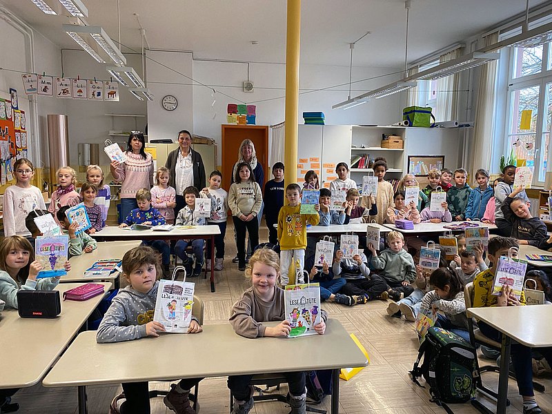 Frau Casper von der Buchhandlung LiteraDur kam zu Besuch und übergab den Kindern Lesetüten! Jedes Kind der neuen ersten Schuljahre erhielt eine fantasievoll bemalte und farbenfrohe Lesetüte. Das Schöne war, dass die Kinder der zweiten Klasse die Blankotüte für die Schulanfänger gestaltet haben und sie nun zum Schuljahresbeginn überreichten. Die Kinder nahmen die Lesetüten mit Begeisterung entgegen. In den Tüten befanden sich das Erstlesebuch „Frau Frieda ermittelt“, ein Türgriffanhänger („Kein Eintritt, lese gerade“) und ein Antolin Lesezeichen. Es ist eine schöne Tradition, dass die Erstklässler solche Lesetüten erhalten.